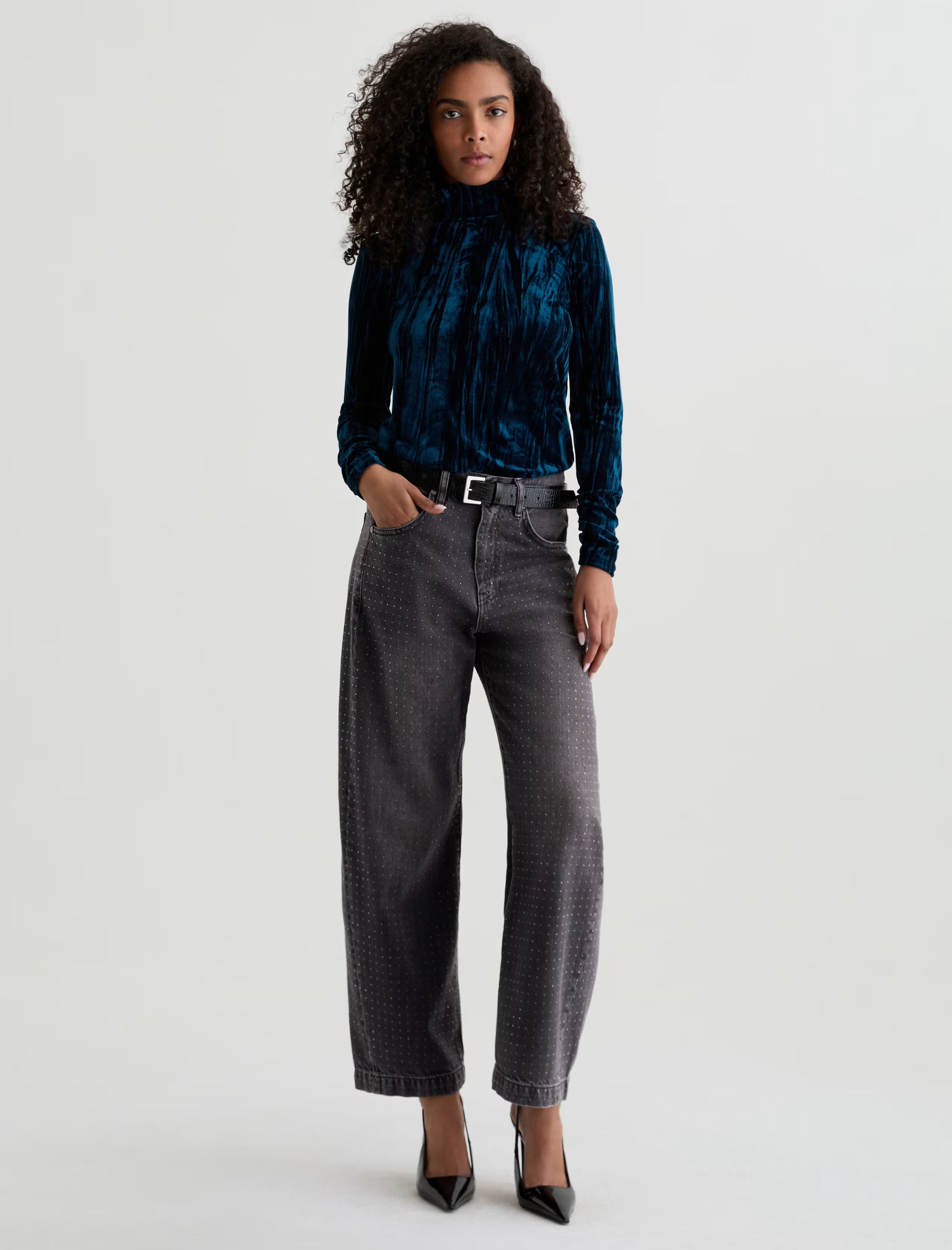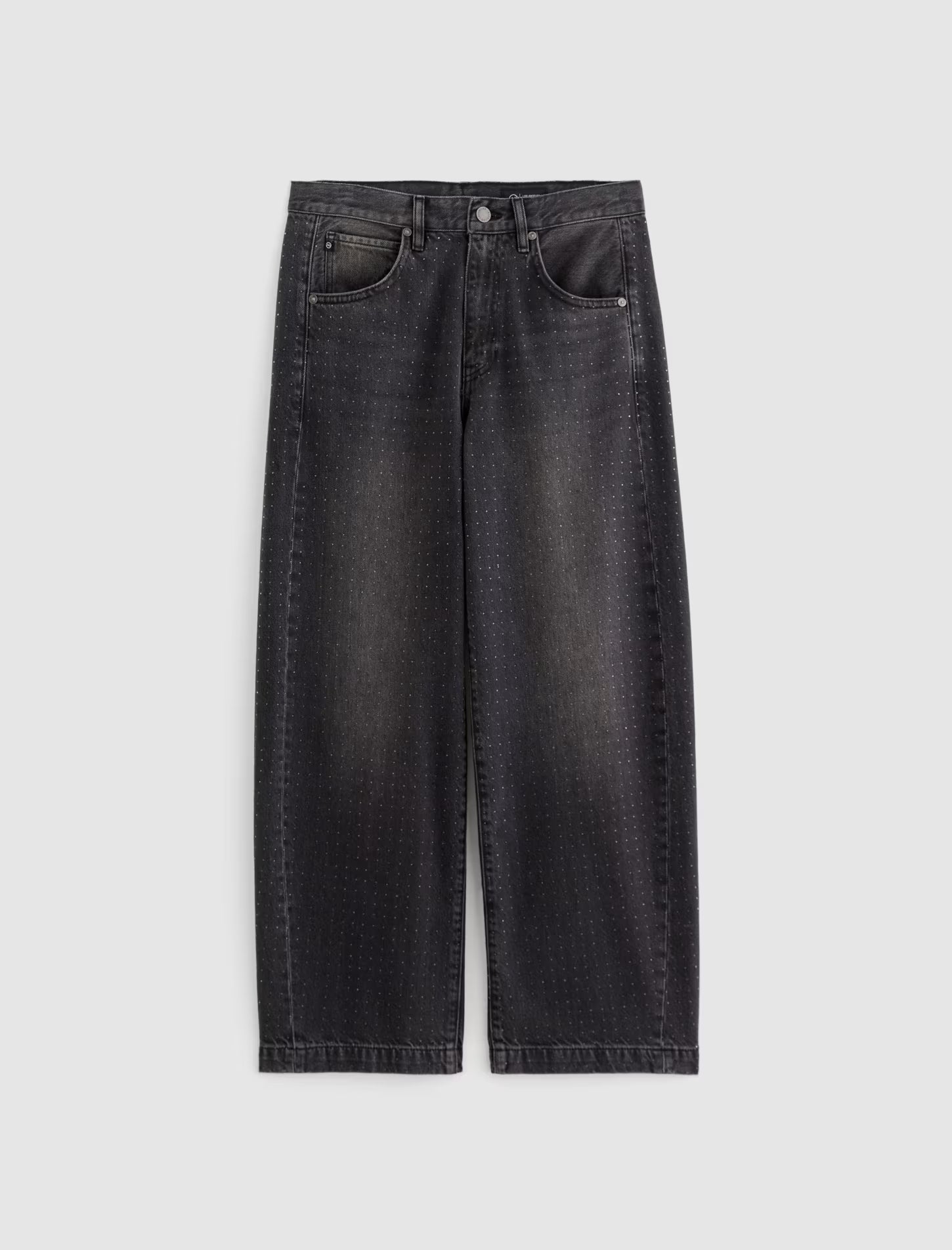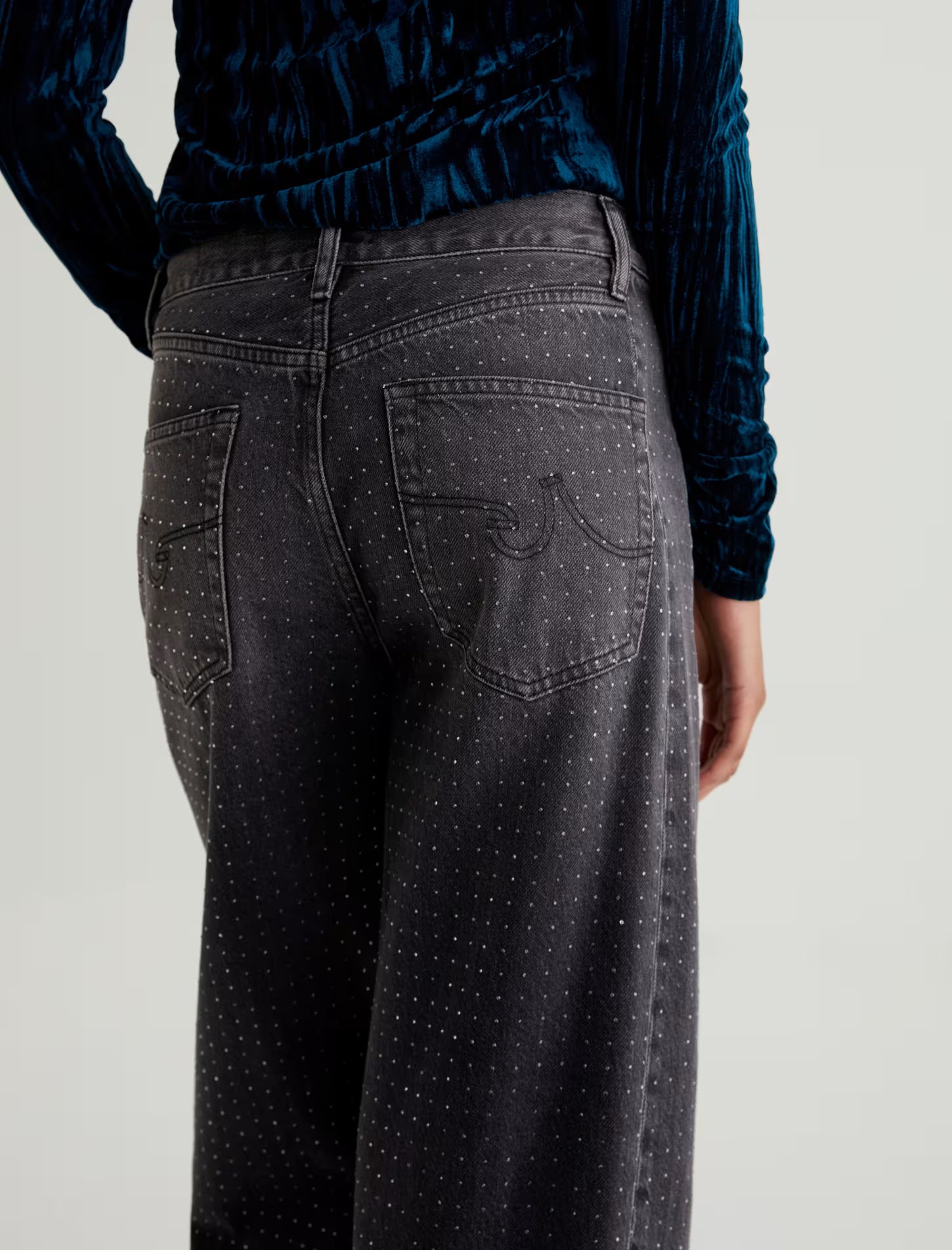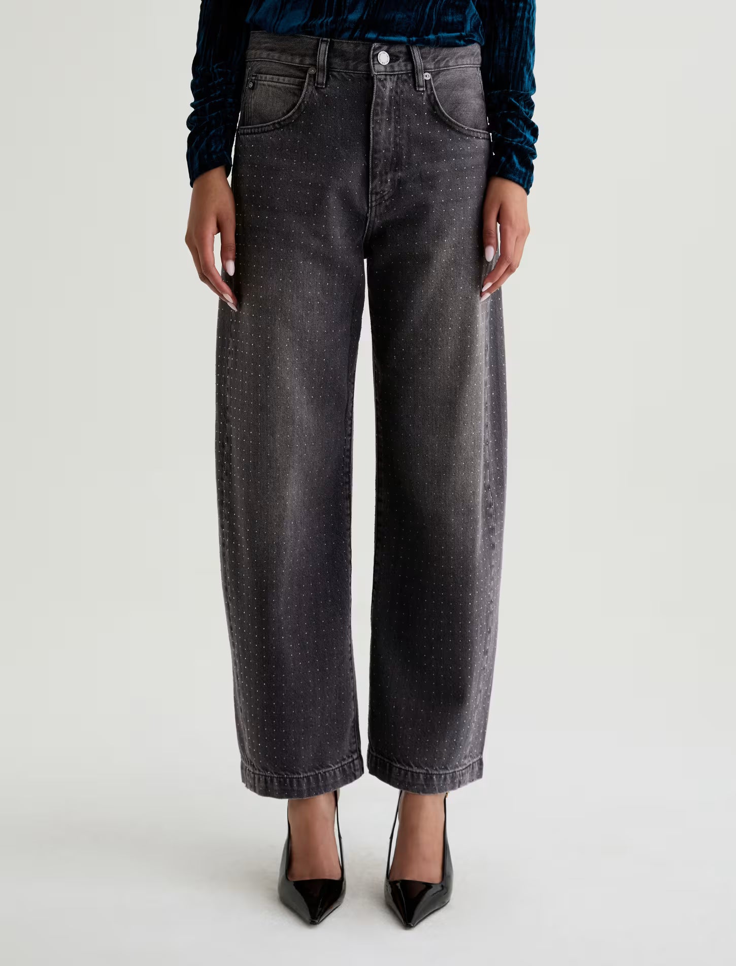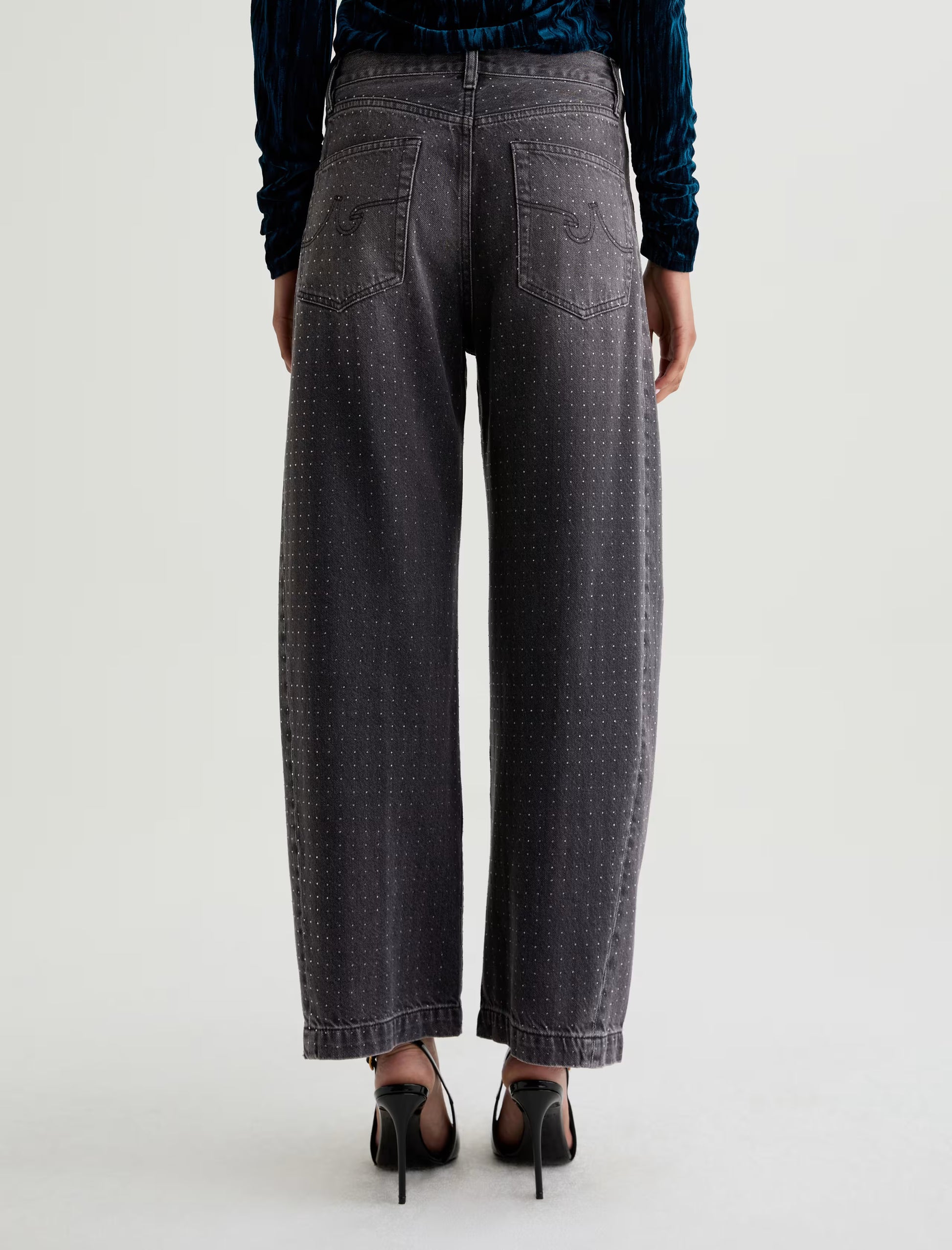 Hattie is a fashion-forward barrel leg, featuring a high-rise and a distinctive curved shape through the leg, enhanced by side seam paneling. This style hits at the ankle with a wide opening and an all-over clear rhinestone embellishment that adds the right amount of glamour to an outfit. Designed with classic five-pocket styling and premium construction for everyday wear.