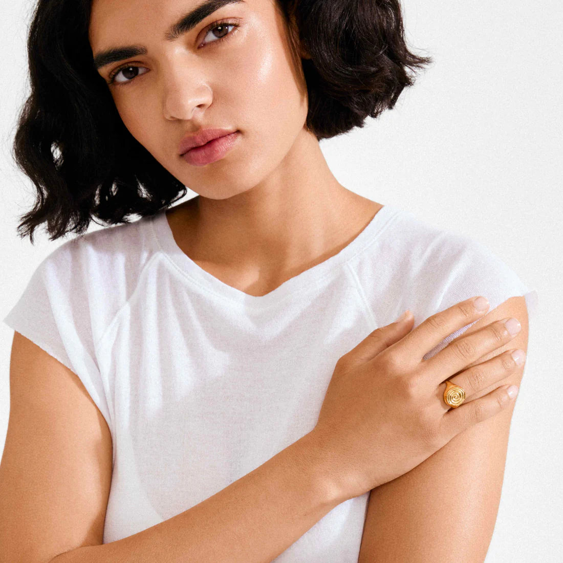 Elevate your everyday with the AIR signet ring from Pilgrim — a stunner with serious handcrafted vibes. The spiral detail draws from ancient Nordic design, now with a bold, urban edge. Wear it on your index finger as a modern statement and style it with loose layers for that effortless energy. It’s adjustable for a perfect fit, waterproof and made from 99% recycled materials — because we’re all about planet-friendly style.