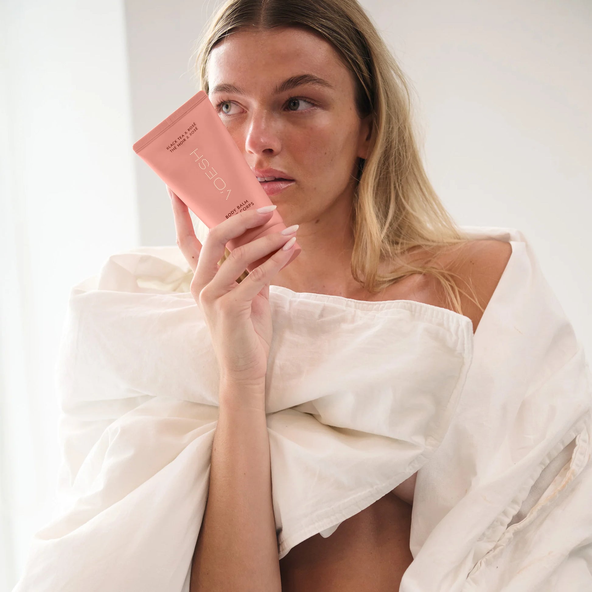 A buttery-soft balm that resets your skin and senses. Our hydrating body balm delivers deep, long-lasting moisture for skin that says touch me, smell me. The lightweight, non-greasy formula melts in, leaving your skin nourished and beautifully scented all day with a rich, floral, tea-inspired fragrance.