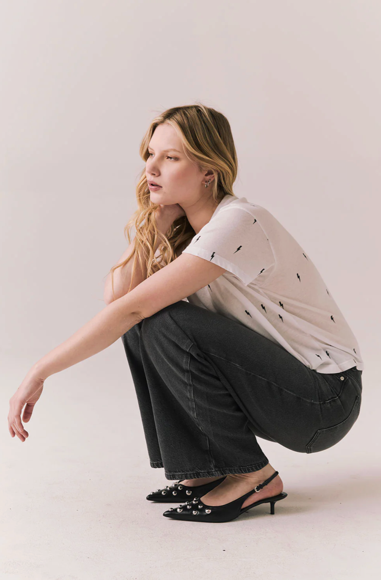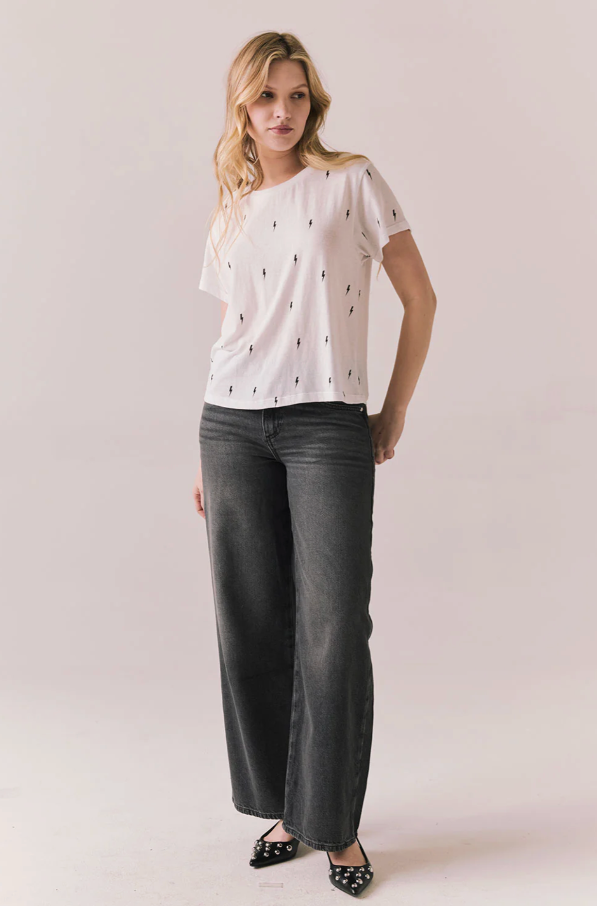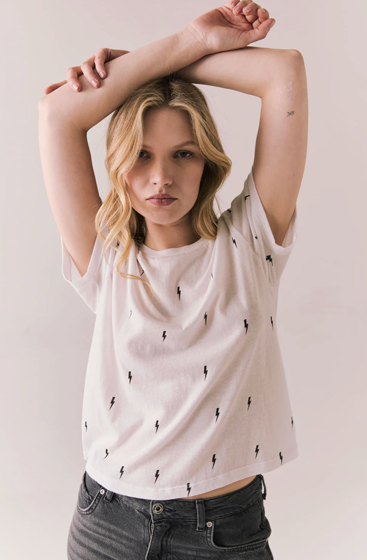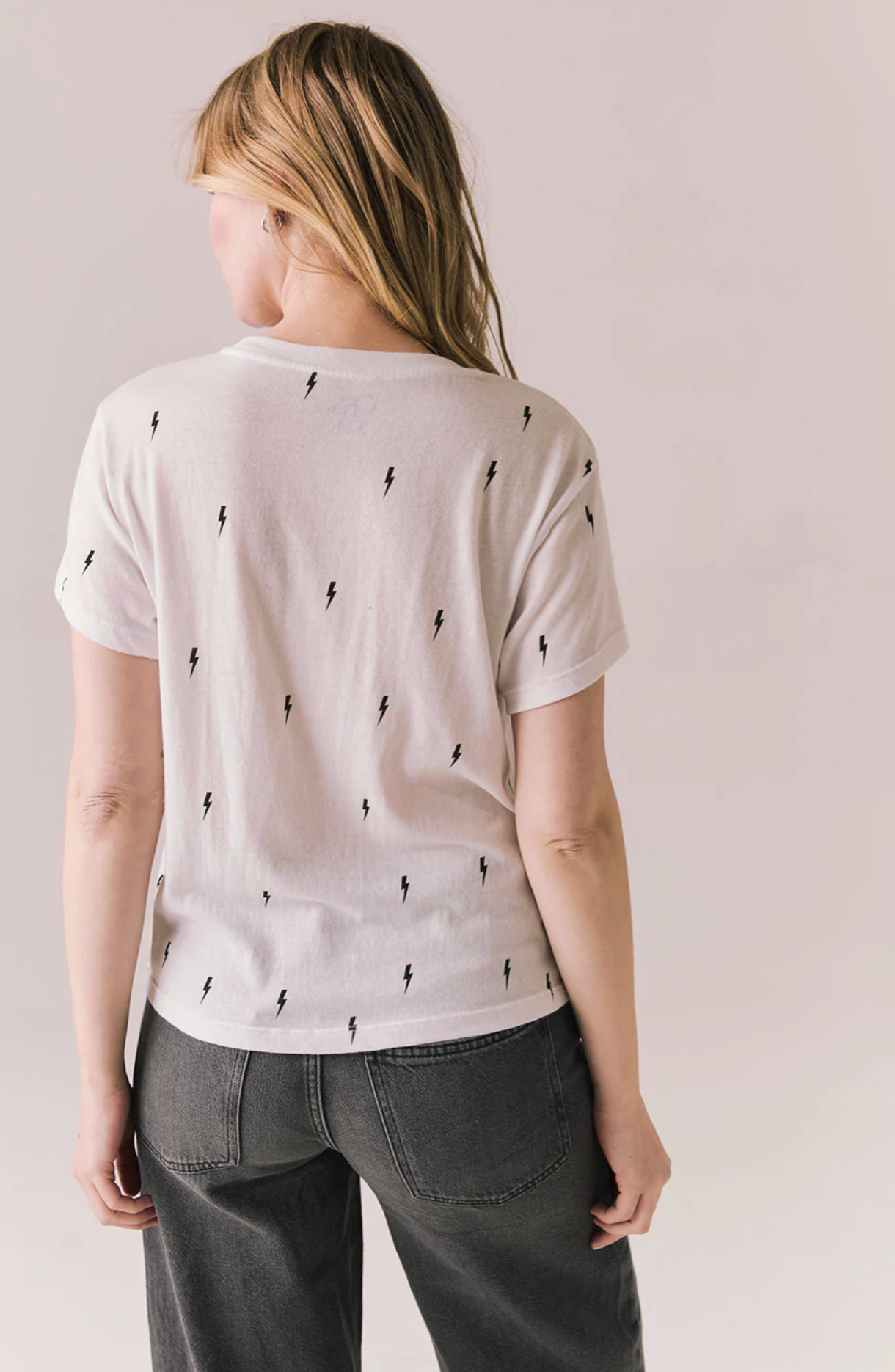 The Tossed Bolts Tee in white delivers instant rocker energy with black lightning bolts scattered across the soft jersey base.