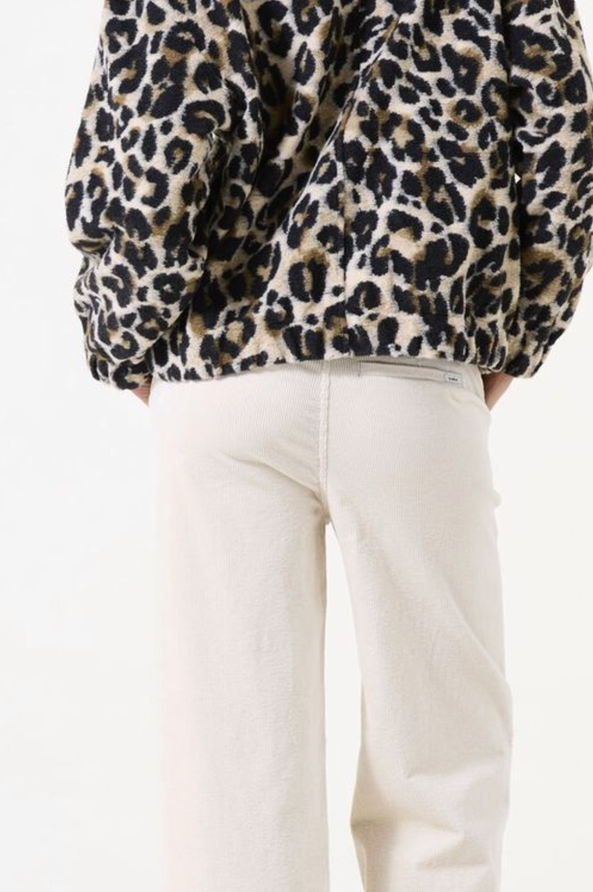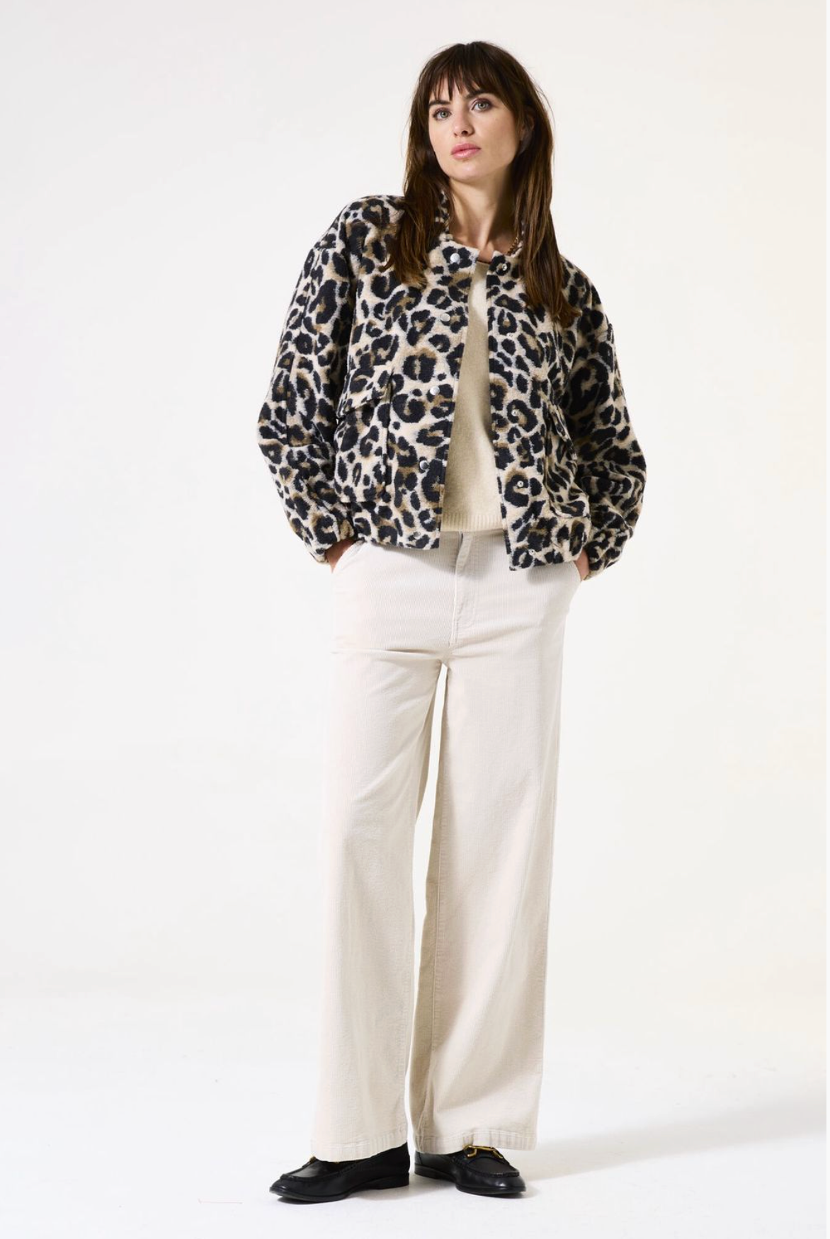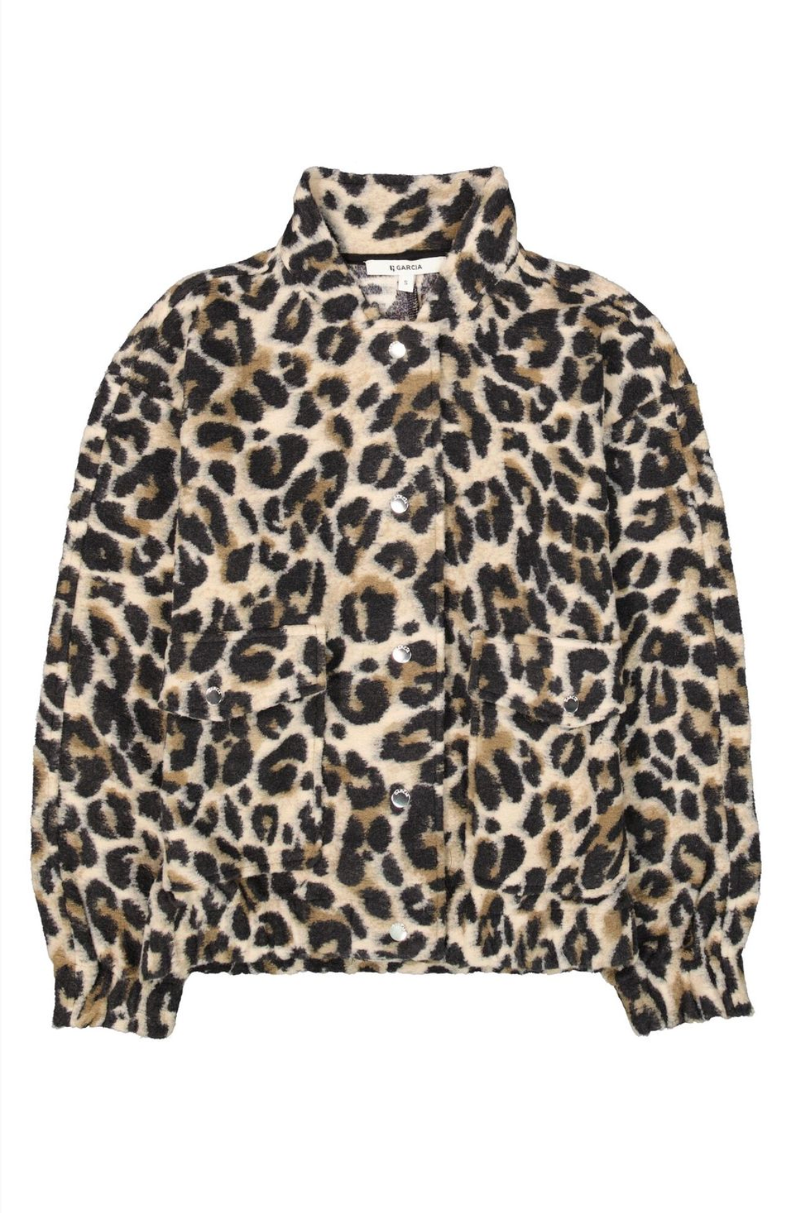 Cozy transitional jacket in a trendy leopard pattern with front pockets and snap button enclosure. Comprised of 100% polyester.